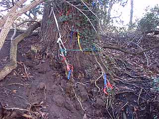 ....... . Speight's mention of two other revered springs in the wood could explain the differences between the old photographs shown on this page, which appear to be two different wells sites. Neither picture seems to show any obvious signs of water flowing from the wells and in another book, Bogg noted there was scarcely any water to be seen at the well. Its is interesting to note that even with the lack of water, the tradition of leaving strips of clothes at the site continued. The modern OS map only marks "St Helen's Well (site of )" and several years ago i was told that the site had been destroyed when a large factory was built. However a visit to the area showed that Chapel Wood still existed even though the land around it has been developed as part of Thorpe Arch trading estate. The wood itself seemed relatively undisturbed, and on its east side it was possible to trace the ditch and bank described by Bogg. This ditch appears to be the course of a dried up stream, which at one time ran along the eastern edge of Chapel Wood, with the St Helens spring flowing into it. On the southern edge of the wood the buried remains of a small stone bridge were noted and this would have originally crossed the stream. Unfortunately on this visit it was not possible to use the photographs to definitely identify the site of the well and there were no obvious water sources to be seen. At a later date the opportunity arose to study a first edition (1850) OS map of this area and this map marked the actual position of the St Helen's well. The map also showed the small bridge over the stream, and with this information a return visit was made to Chapel Wood. From the position of the bridge it was possible to estimate the site of the well to within a few metres and this location resembled that shown in the old photograph at the top of this page. but today the actual spring site must lie buried by soil on the slope of the bank. This might have been due to natural soil creep down the banking or more likely when the old tree above the well toppled over. If this is the case then it would be possible to clear the soil and restore the site to something like the picture/ On the visit to Chapel wood in January 2000 it was also noted that an old tree stump had been decorated with different coloured ribbons (see pic 3) and it would appear that this stump has been identified as the remains of the tree shown in the 1907 photo (pic 2 and possibly the 1934 photo shown in the Bord's Holy wells book?). This site is actually a little further north into the wood than the St Helen's well site marked on the 1850's OS map and again this probably relates to Speight's comment about their been two other 'sacred' springs in the wood. All this might suggest that the 'official' St Helen's well near the stone bridge (and nearer the chapel?) may have dried up in the late 1800's, and the focus moved to another still active spring a little further up stream. The old OS map shows a gravel pit alongside the wood and very near the well, so extracting the gravel may have cut off the supply of water to the spring. (1) Edmund Bogg, Lower Wharfedale 1904. remains of st helen's chapel to thorpe arch church? check